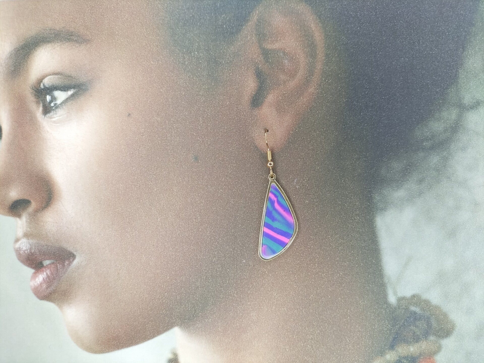 Boucles d’oreilles en pâte polymère, cerclage en acier, finition résine époxy
