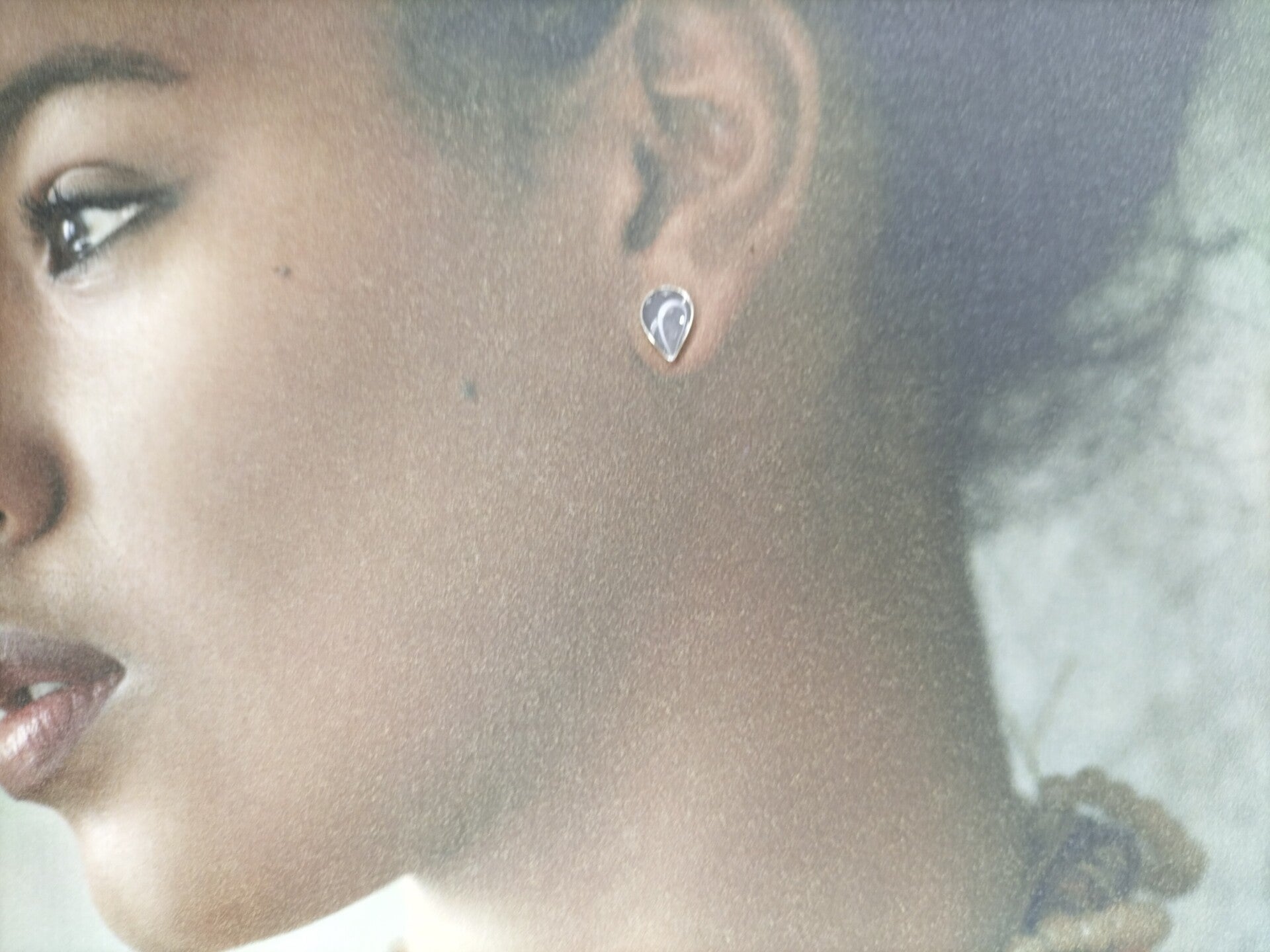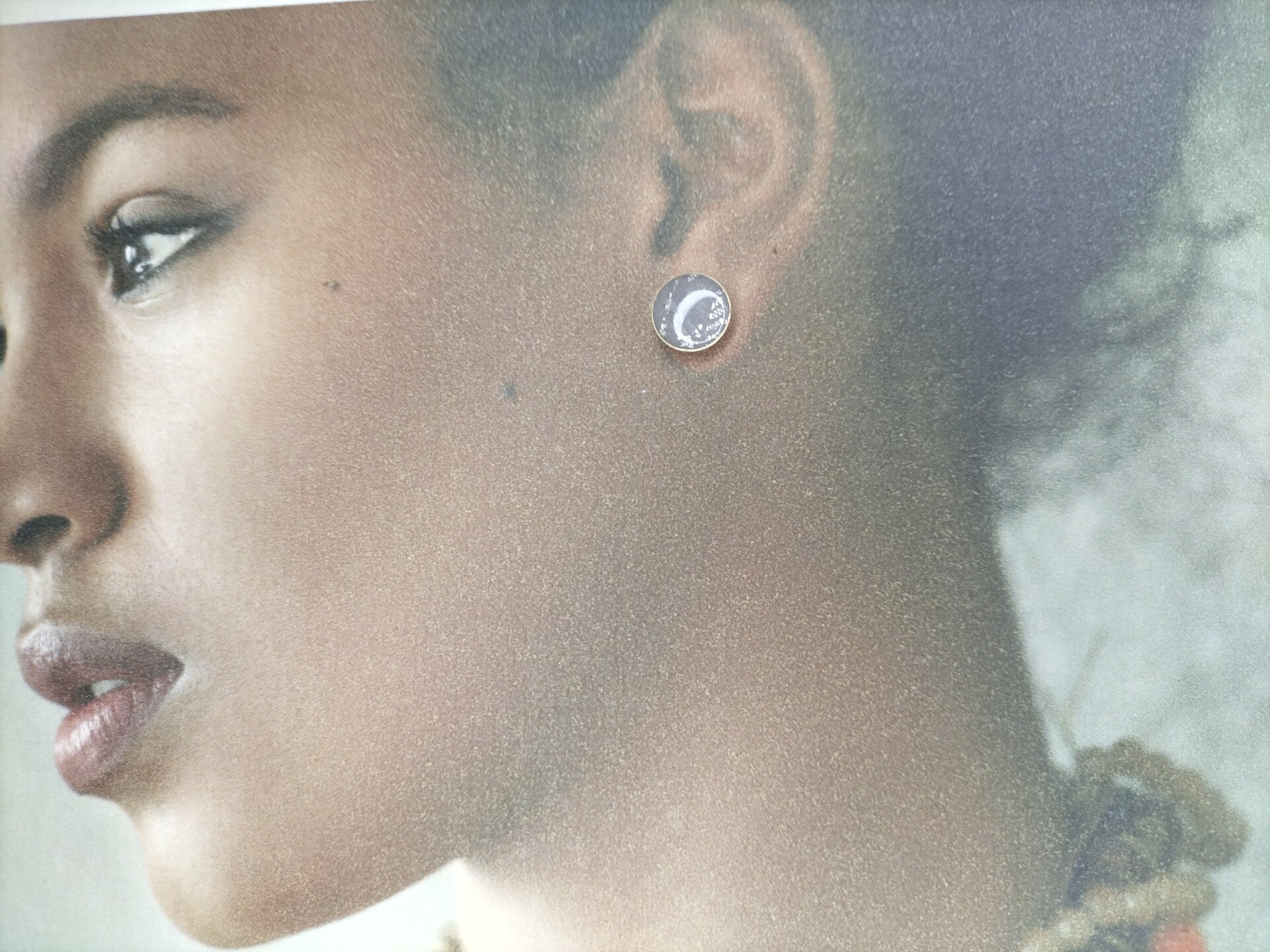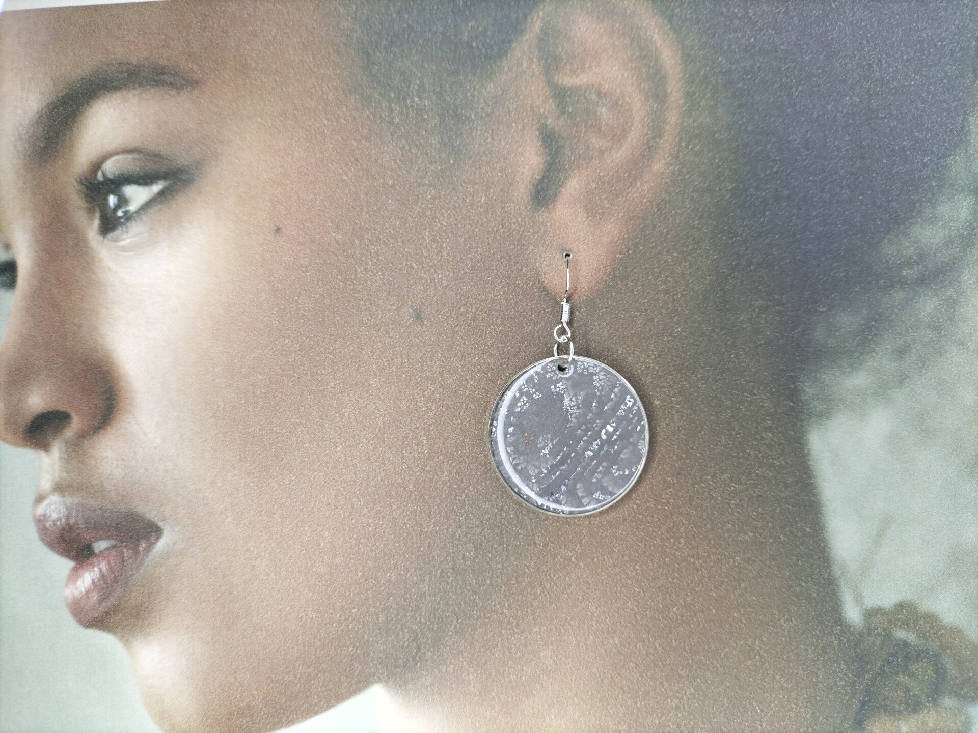Boucles d’oreilles en pâte polymère, cerclage en acier, finition résine époxy