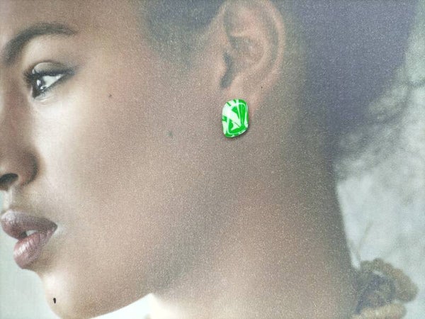 Boucles d’oreilles en pâte polymère, cerclage en acier, finition résine époxy