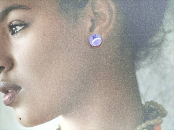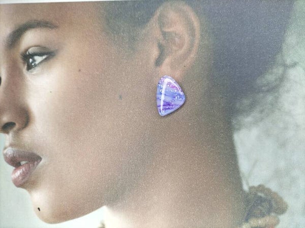 Boucles d’oreilles en pâte polymère, cerclage en acier, finition résine époxy